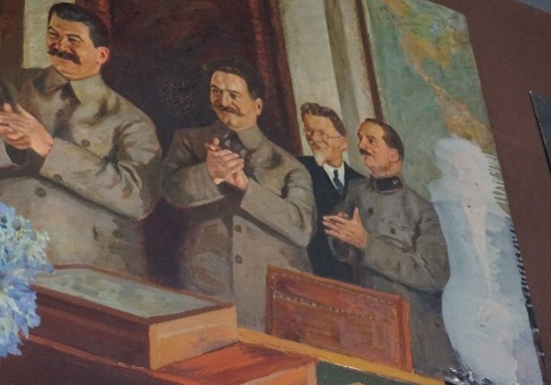 behind Stalin (probably Nikolai Yezhov) was painted black and the other one, probably Lavrentiy Beria, was less skilfully painted white (far right).